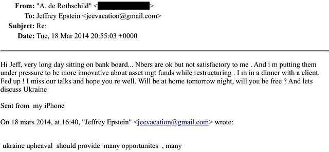 Finding out the “key shareholders” should not be too difficult if we wanted to prevent the war from escalating further. Today we even know one suspect by name, thanks to her correspondence with her pet employee, Jeffrey Epstein: Arianne de Rothschild, CEO of the Edmond de Rothschild Group. Here’s an email eschanged between them only three days after Kiev launched their ATO: